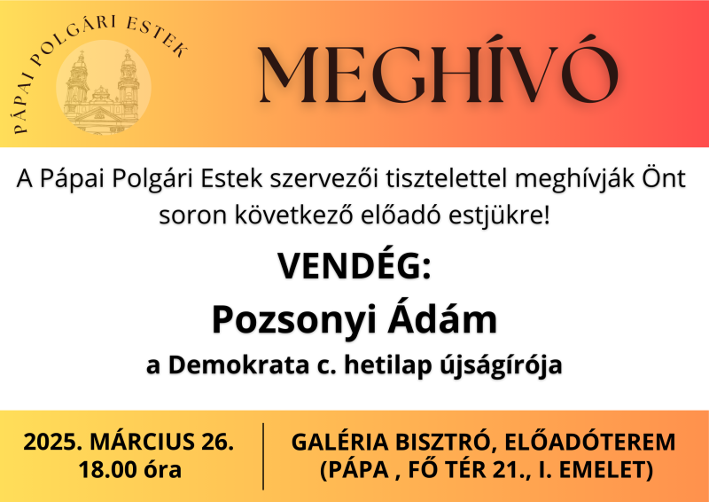 A Pápai Polgári Estek vendége Pozsonyi Ádám, a Demokrata újságírója Programok papairanytu.hu 2025. március 20. Forrás https://papairanytu.hu Hozzászólások